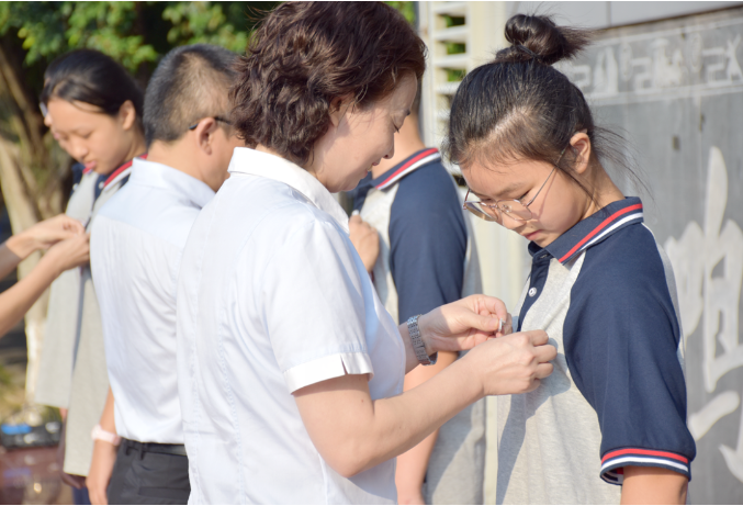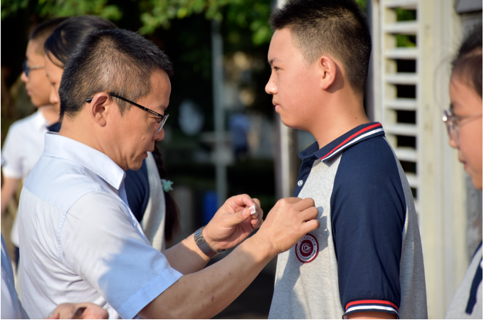 在庄重的仪式中,遂宁中学党委书记张东等校级领导,为新生代表佩戴校徽并鼓励他们在新的学期里以爱校荣校的精神为指引,为自己的梦想而努力奋斗。