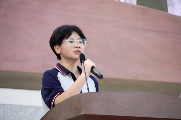 林欣怡代表全体初一新生郑重承诺:会用求知的艰辛、拼搏的快乐来丰富生命的色彩,用飞扬的青春、跳动的热情来谱写心中的梦想!同时,将牢记师长的教诲,以锐意进取的高年级的高年级的同学们为榜样,不断充实自我、完善自我、升华自我,成长为一名优秀的中学生,为学校增光添彩。